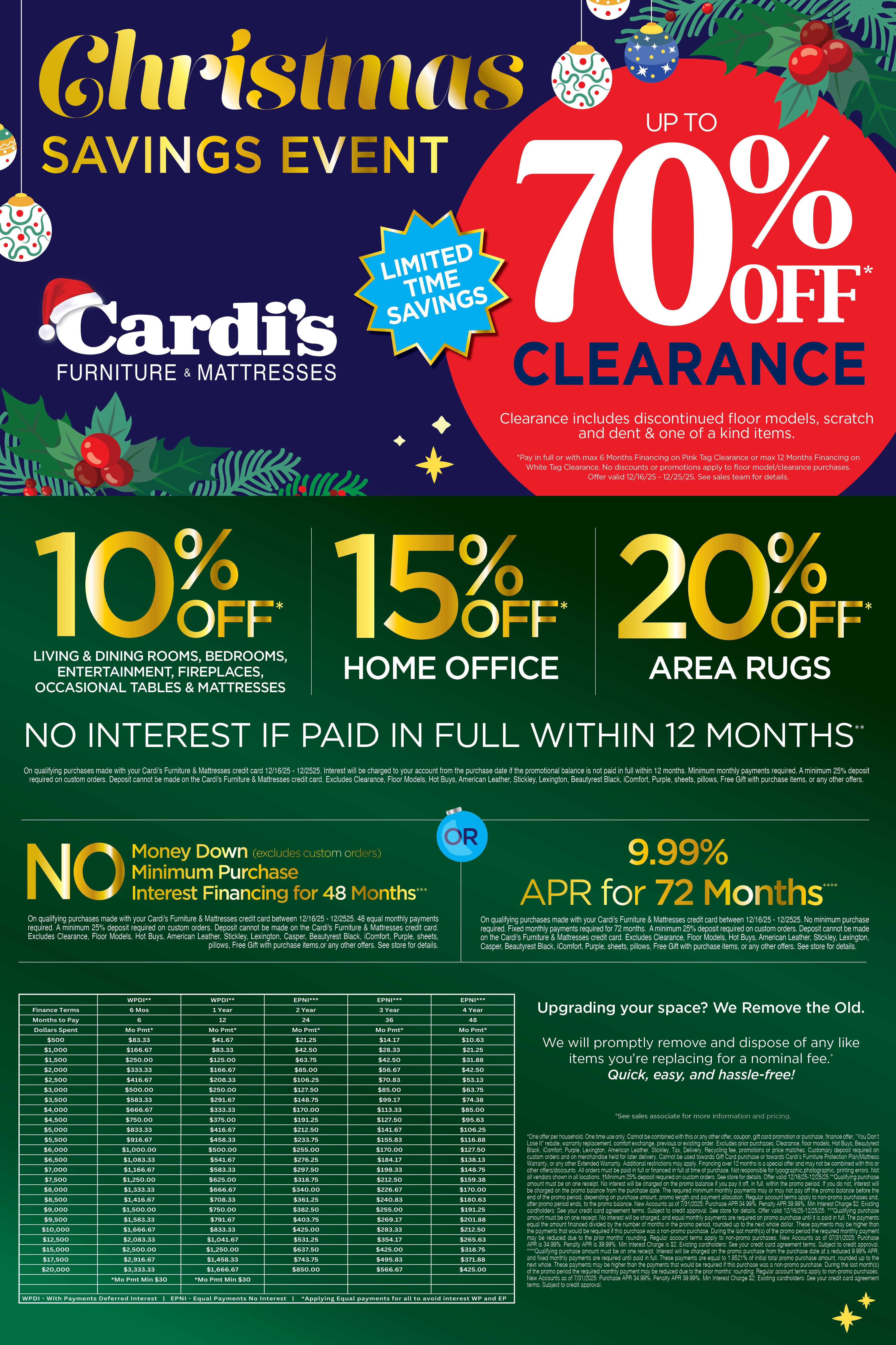 *One offer per household. One time use only. Cannot be combined with this or any other offer, coupon, gift card promotion or purchase, finance offer, “You Don’t Lose It” rebate, warranty replacement, comfort exchange, previous or existing order. Excludes prior purchases, Clearance, floor models, Hot Buys, Beautyrest Black, iComfort, Purple, Lexington, American Leather, Stickley, Tax, Delivery, Recycling fee, promotions or price matches. Customary deposit required on custom orders and on merchandise held for later delivery. Cannot be used towards Gift Card purchase or towards Cardi’s Furniture Protection Plan/Mattress Warranty, or any other Extended Warranty. Additional restrictions may apply. Financing over 12 months is a special offer and may not be combined with this or other offers/discounts. All orders must be paid in full or financed in full at time of purchase. Not responsible for typographic,photographic, printing errors. Not all vendors shown in all locations. †Minimum 25% deposit required on custom orders. See store for details. Offer valid 12/16/25-12/25/25.**Qualifying purchase amount must be on one receipt. No interest will be charged on the promo balance if you pay it off, in full, within the promo period. If you do not, interest will be charged on the promo balance from the purchase date. The required minimum monthly payments may or may not pay off the promo balance before the end of the promo period, depending on purchase amount, promo length and payment allocation. Regular account terms apply to non-promo purchases and, after promo period ends, to the promo balance. New Accounts as of 7/31/2025: Purchase APR 34.99%. Penalty APR 39.99%. Min Interest Charge $2. Existing cardholders: See your credit card agreement terms. Subject to credit approval. See store for details. Offer valid 12/16/25-12/25/25. ***Qualifying purchase amount must be on one receipt. No interest will be charged, and equal monthly payments are required on promo purchase until it is paid in full. The payments equal the amount financed divided by the number of months in the promo period, rounded up to the next whole dollar. These payments may be higher than the payments that would be required if this purchase was a non-promo purchase. During the last month(s) of the promo period the required monthly payment may be reduced due to the prior months’ rounding. Regular account terms apply to non-promo purchases. New Accounts as of 07/31/2025: Purchase APR is 34.99%. Penalty APR is 39.99%. Min Interest Charge is $2. Existing cardholders: See your credit card agreement terms. Subject to credit approval. ****Qualifying purchase amount must be on one receipt. Interest will be charged on the promo purchase from the purchase date at a reduced 9.99% APR, and fixed monthly payments are required until paid in full. These payments are equal to 1.8521% of initial total promo purchase amount, rounded up to the next whole. These payments may be higher than the payments that would be required if this purchase was a non-promo purchase. During the last month(s) of the promo period the required monthly payment may be reduced due to the prior months’ rounding. Regular account terms apply to non-promo purchases. New Accounts as of 7/31/2025: Purchase APR 34.99%. Penalty APR 39.99%. Min Interest Charge $2. Existing cardholders: See your credit card agreement terms. Subject to credit approval.